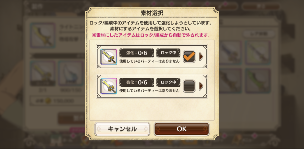 具体的な開発内容としては「今まで1段階ずつだった強化を一気に強化できるようにした改修」と、「デフォルトでロックされている武器や装飾品も、ポップアップを表示した上で素材に使用できるようにした改修」でした。